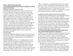 This note includes: W1 White-Collar Crime: Introduction and Overview: What Is White-Collar Crime? W2 Who Is the White-Collar Offender?; Explaining White-Collar Crime: Traditional Criminological Theories W3 Explaining White-Collar Crime: The Opportunity Perspective W4 Financial Crimes in Health Care, Mortgages, Securities and Markets W5 Corporate Violence: Environmental, Workplace, and Manufacturing Offenses W6 The Symbolic Construction of Opportunity and the Social Distribution of Opportunity: Class, Gender, and Race W7 Corporate Crime and Corporate Governance W8 Corporate Crime and Corporate Social Responsibility W9 Legal Controls: The Criminal Justice, Regulatory, and Civil Justice Systems W10 Opportunities and Situational Prevention of White-Collar Crime: Using Legal and Extralegal Controls W11 The Role of Auditors, Whistle- blowers, Regulators and Prosecutors; Opportunities and the Future of White-Collar Crime For each week you will get: Weekly MCQ questions + answers Long case questions + structure + answers