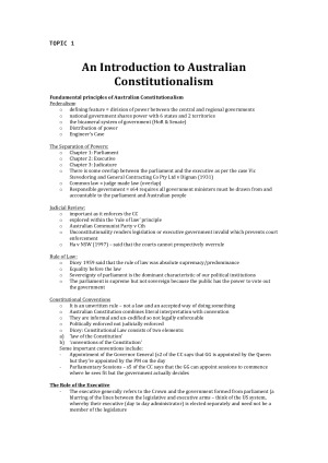This subject is challenging so I made my notes as clear and concise as possible so that they were simple, straight to the point and easy for me to understand. All lecture material, text book material and topics guide material covered Step by step process of unpacking the material and applying it to cases Topics covered: 1. An Introduction to Australian Constitutionalism 2. Parliament and Legislative Procedures 3. Characterisation 4. Spending and Appropriation powers 5. External Affairs power 6. The Executive 7. Inconsistency and inter-governmental immunities 8. Constitutional Rights and Freedoms 9. Separation of Powers