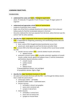 Detailed notes for each learning objective for the foundations, sensory systems, movement, ANS, and vignettes topics covered. I used these notes as my revision material in preparation for the end of semester exam, since the questions are based off the learning outcomes, covering notes from my own research, lectures, labs and textbooks. Includes my notes from topics that I missed and had to teach myself.