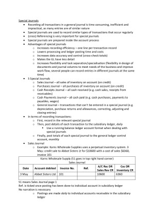 Comprehensive notes based on the material from all 13 weeks of lectures, tutorials, and textbook readings. Topics include: - Introduction to accounting - Accrual accounting concepts - Recording, analysing, managing and reporting merchandising operations - Accounting subsystems - Receivables - Recording, analysing, managing and reporting non-current assets - Recording, analysing, managing and reporting liabilities - Recording, analysing, managing and reporting equity - Recording, analysing, managing and reporting cash flows - Evaluating an entity - Ethics in accounting These notes helped me do well and so would highly recommend them!!