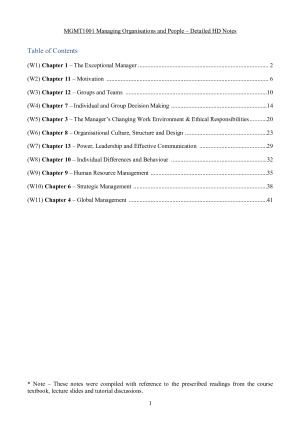 These HD notes provide a detailed overview of the entire semesters course content. By reading and studying these notes, which were compiled with reference to weekly prescribed textbook readings, lecture slides and tutorial content, you will be able to deepen your understanding of the MGMT1001 course concepts and hopefully improve your final results. Content included: Chapter 7: Individual and group decision making Chapter 1: The exceptional manager Chapter 12: Groups and teams Chapter 11: Motivating employees Chapter 10: Managing individual differences and behaviours Chapter 9: Human resource management Chapter 13: Power, leadership and effective communication Chapter 8: Organisational culture, structure and design Chapter 6: Strategic management Chapter 4: Global management