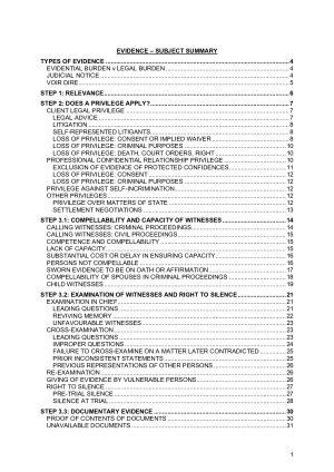 Complete summary covering the entire Evidence subject from beginning to end, including ALL relevant authorities for assignments and final exam. This summary incorporates notes from the required readings, additional readings, lecture slides and tutorials. Evidence is a content-dense subject so a perfect, concise set of notes is exactly what you need to ace the subject! - Types of evidence - Step 1: Relevance - Step 2: Privileges - Step : Compellability and capacity of witnesses - Step : Examination of witnesses and right to silence - Step : Documentary evidence - Step : Real evidence (exhibits and views) - Step 4: The hearsay rule - Step 5: The opinion rule - Step 6: The tendency and coincidence rules - Step 7: The credibility rule - Step 8: Exclusionary rules