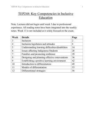Contains notes for every lecture excluding information regarding assessments. Readings are mostly integrated into the notes and this was most logical (for some weeks they are separate). The topics are as follows: Inclusion Inclusion legislation and attitudes Understanding learning difficulties/disabilities Issues affecting Indigenous Students Families and promoting resilience Designing and planning effective interventions Establishing a positive learning environment Introduction to differentiation Models of differentiation Differentiated strategies There is no content for week 1 and 2 due to professional experience blocks.