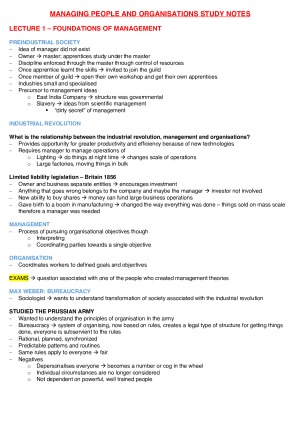 - 44 pages of in-depth notes taken in both lectures and tutorials throughout the course - Includes lecture content, case studies and examples - Colour-coded with definitions, case studies and references - Easy to read, nicely formatted notes that helped me achieve an excellent mark in this subject TOPICS: • Foundations of Management • Power, Resistance and Post-Bureaucracy • Culture • Leadership • Managing Individuals • Managing Teams and Groups • Human Resource Management • Managing Sustainability, Ethics and CSR • Globalisation • Managing Communication • Knowledge, Learning and Innovation