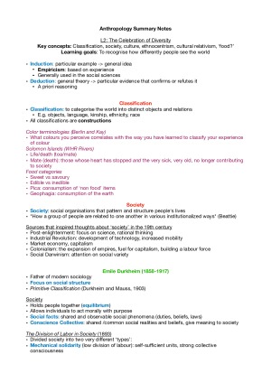 Summary notes for Anthropology: Studying Human Diversity. All lectures from weeks 2-11 are covered. Topics include The Celebration of Diversity; Meeting Needs; Gifts and Reciprocity; Structure, Politics, Law and Order; Incest, Sex and Marriage; Symbols, Rituals and Eating People; The OK Tedi mine; Magic, Religion and Science; Understanding Others, Understanding Selves; and Using Anthropology in Work and in Life.