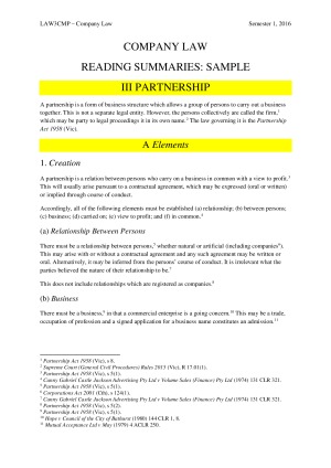 Summaries compiles information from lectures, tutorials, textbooks, commentary, legislation and case law. Textbook used wasP Hanrahan, et al, Commercial Applications of Company Law (16th ed, 2015, Wolters Kluwer CCH, Sydney). Very thorough and includes sources of all information. Written for the purpose of problem-solving during exams. Topics covered include: 1. Choice of entities; 2. Partnerships; 3. Companies; 4. Corporate liability; 5. Loan capital and external management; 6. Capital reduction; 7. Decision making powers; 8. Information disclosure; 9. Director and promoter duties; and 10. Members' rights and remedies.