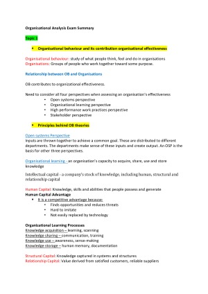 Fantastic overview of the course that contains a summary of lectures, readings and examination materials. Concise, yet detailed notes. All that is needed to achieve a HD in the exam!! In-depth notes that contain all that is needed to achieve an HD on the exam. Contains summary of all lectures, readings and exam materials. Precise and clear notes that helped me achieve a 90 mark. Topic list is as follows: - Identify different analytical perspectives employed to understand organisations at the individual, social, structural and systemic levels. -Interpret and apply these multiple perspectives to empirically analyse specific organisations and the contexts in which they operate. -Draw on different analytical perspectives as the basis for a multidisciplinary approach towards organisational functionality, political and social relations. -Evaluate knowledge assumptions and come to recognise their management implications and practical consequences. -Assess and judge how organisational analysis can be used to engender solutions to organisational challenges that are socially responsible.