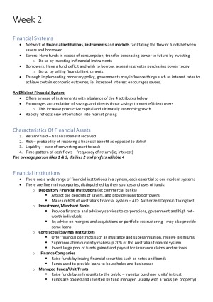 Concise and informative notes for FINC2011, covering all topics: Topic 1 - Introductory Lecture Topic 2 - A Modern Financial System Topic 3 - Financial Mathematics Topic 4 - Valuation of Bonds Topic 5 - Valuation of Shares Topic 6 - Capital Budgeting I Topic 7 - Capital Budgeting II Topic 8 - Introduction to Risk & Return Topic 9 - Portfolio Theory & CAPM Topic 10 - Risk and the Cost of Capital Topic 11 - Market Efficiency Topic 12 - Business Ethics