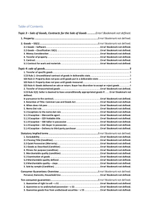 Easy to follow, thorough notes with good structure and layout. All you need to achieve a HD in this unit. Ready to print. Notes include: Table of contents Coloured headings Diagrams & pictures All relevant legislation & case law Definitions Content includes: Sale of goods Property Nemo dat Consumer guarantees Unconscionable conduct Australian consumer law Security interests Defences