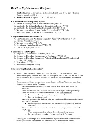 I am a serial note taker, my notes encompass an exhaustive list of case summaries, diagrams and examples. The topics covered are not limited to the following: - Registration and Discipline - Consent to health Care - Patient Rights and Safety - Medical Information and Records - Torts, Crime and Discrimination - Alternative Approaches to Compensation - Organ Transplantation and Blood Transfusion - Mental Health - Reproduction and Birth - Determination of Death