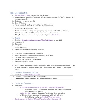 Complete individual summary of lectures, readings and tutorials and potential essay structures. List of topics covered: Topic 0: History, Development, Scope, Nature of PIL Topic 1: Sources of PIL Topic 2: International Legal Personality, Statehood, Recognition, Self-determination Topic 3: Title to Territory Topic 4: Treaties Week 6: PIL + Municipal Law Week 7: State Jurisdiction Week 8: Immunity from Jurisdiction: Diplomatic and Consulate Immunity Week 9: Immunity from Jurisdiction: State and Head of State Immunity Week 10: State Responsibility 1 Week 11: State Responsibility 2 - Treatment of Aliens and Diplomatic Protection Week 12: Use of Force Week 13: Dispute Settlement Potential Essay Structures: DOes the UNSC have too much power Recognition leading to being an international person or not