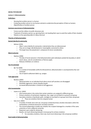 TABLE OF CONTENTS (includes all lectures) 1. Lecture 1: Dehumanisation 2. Lecture 2: Self & Identity 3. Lecture 3: Mirror Neurons 4. Lecture 4: Attribution & Social Explanation 5. Lecture 5: Cults 6. Lecture 6: Emotions & Social Processes 7. Lecture 7: Emotions & Social Processes 8. Lecture 8: Nonverbal Communication 9. Lecture 9: Empathy & Morality 10. Lecture 10: Modern Group Biases 11. Lecture 11: Loneliness 12. Lecture 12: Social Neuroscience 13. Lecture 13: Neuroscience of Prejudice 14. Lecture 14: Cognitive Dissonance 15. Lecture 15: Terror Management Theory 16. Lecture 16/17: Attraction & Close Relationships 17. Lecture 18: Hormones & Social Behaviour 18. Lecture 19/20/21/22: Aggression Research 19. Lecture 23: Anger Regulation