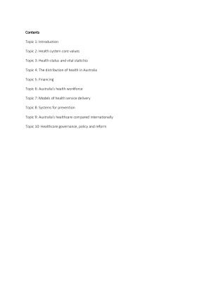- Covers topic 1-10 (week 1-10) Topic 1: Introduction Topic 2: Health system core values Topic 3: Health status and vital statistics Topic 4: The distribution of health in Australia Topic 5: Financing Topic 6: Australia’s health workforce Topic 7: Models of health service delivery Topic 8: Systems for prevention Topic 9: Australia’s healthcare compared internationally Topic 10: Healthcare governance, policy and reform - Includes content from the cloud site and prescribed weekly readings