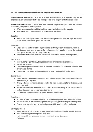 Lecture One: What is management? Evolution of management Lecture Two: Managing the Environment: Organisational Culture Lecture Three: Managing Change and Diversity Lecture Four: Ethics and Corporate Social Responsibility Lecture Five: Managing leadership and managing motivation Lecture Six: Managing decision-making and managing information Lecture Seven: Managing strategy and structure: planning Lecture Eight: Managing Control Process: Operations Management Lecture Nine: Managing Human Resources Lecture Ten: Managing in Global Environment Lecture Eleven: Change, Innovation and the Future of Management