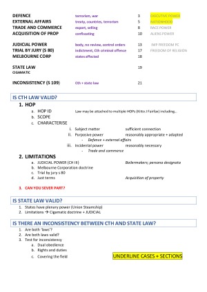 ALL YOU NEED FOR YOUR EXAM!!!! Very condensed notes. Topics include: - Defence power - External affairs power - Trade and commerce power - Acquisition of property - Judicial power - Trial by jury s 80 - Melbourne corporation doctrine - State laws - Inconsistency s 109 Provides a structure for determining the validity of a Commonwealth Law and State Law, as well as for resolving an inconsistency between a Commonwealth and State Law. Notes are colour coded - all relevant cases included with condensed description of facts and findings. Pages are numbered.