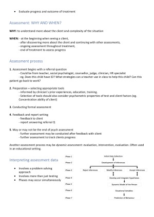 Comprehensive study guide unit notes for honours year psychological assessment. Weekly content: W1 Intro to psych testing and report writing W2 Norms and reliability W3 Validity and reliability W4 Cultural and Ethical Issues W5 Intelligence Testing W6 Intelligence Testing W7 Clinical Assessment W8 Clinical Assessment W9 Personality Assessment W10 Personality Assessment