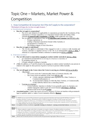 Complete competition and consumer law notes. Set out clearly for an exam, essentially all you need to do is use the template and add in the facts of the problem. TOPICS: Markets Authorisation and penalties Misuse of market power Resale price maintenance Intro to consumer law Manufacturer liability Product safety Unconscionable conduct Unfair contract Misleading and deceptive conduct Consumer guarantees