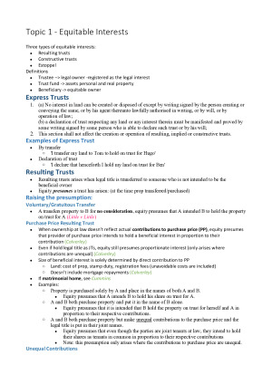 Topics include: - Equitable interests - Estoppel - Co-ownership - Mortgages - Enforceability of property interests - Introduction to Torrens System - The principle of indefeasibility of title - Exceptions to indefeasibility of title - Unregistered interests in Torrens System My notes are laid out in the sense that is it about the particular topic and its principles and at the end of each topic, there is a case summary of each relevant case. My notes are a combination of the lecture notes, tutorial notes, friends notes and the textbook.