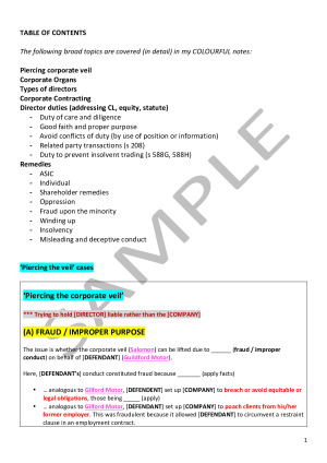 I used these notes to receive an overall mark of 85 (High Distinction) in Business Associations. These notes have been comprehensively put together in a template format and are based on the substantive and policy topics covered in BA. My notes are all COLOUR CODED and NEATLY ORGANISED into different subsections, tables and headings. They also have MINI-PRACTISE QUESTIONS, DIAGRAMS and PICTURES integrated into the notes. In these notes, I've scaffolded a template that can be used in both the mid-sem and final exam problem question. The scaffold contains the issues, rule (law) and then possible ways to apply the law (ie. applying the facts of the case). I have included blank spaces where it is appropriate to apply the facts. There is also a summary of ALL policy issues covered in the course as well as some essay format templates on key areas (ie. sentencing) which appear every year. See sample for contents page. I hope these notes will be as useful to you as they were for me in BA. Having notes COLOUR CODED and NEATLY ORGANISED was a real asset in a time pressured exam.