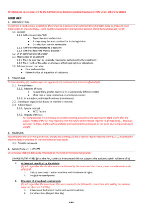Comprehensive but concise notes covering all readings, lectures, and tutorials, with summaries of key cases. Easy to follow and formatted clearly. Also includes detailed step-by-step structures for answering problem questions, with sample introduction sentences. All topics covered in the course are included: - Jurisdiction, Standing & Reasons - Grounds for Judicial Review I: Ultra Vires - Grounds for Judicial Review II: Jurisdictional Error and Error of Law on the Face of the Record - Grounds for Judicial Review III: Procedural Fairness - Remedies - Privative Clauses - Merits Review