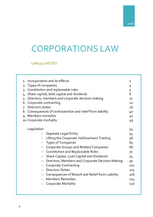 Exam notes made from all relevant readings, lectures and tutorials, and a legislation pack containing all sections listed in the reading guide (took 5+ hours to personally make). Detailed and easy to follow. Topics included: - Incorporation and its effects - Types of companies - Constitution and replaceable rules - Share capital, debt capital and dividends - Directors, members and corporate decision making - Corporate contracting - Directors duties - Consequences of contravention and relief from liability - Members remedies - Corporate mortality