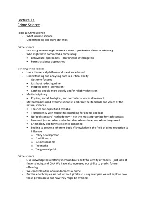 Topic 1 Predicting Risk: Offender Profiling, Interrogation and False Confession Lecture 1a – Crime Science 1b – Predicting Risk and Offender Profiling 1c – Prediction 1d – Predicting Risk 1e – Profiling 1f – Profiling pt. 2 1g – Interrogation and False Confessions 1h – False Confessions Topic 2 The investigative process: Application and Effectiveness of Forensic Science Lecture 2a – Investigative Process 2b – Evidence Types 2c – Serious Crime Investigation Exercise 2d – Forensic Databases 2e – Forensic Evidence – Evaluative Reporting Topic 3 Cognitive Bias in Crime Investigation Lecture 3a – Crime Investigation by Police 3b – forensic scientific evidence Exam Prep