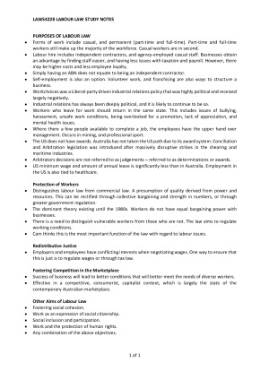 All lecture notes, case notes, readings and discussion points from class. Run in summer session. TOPIC LIST: Purposes of Labour Law Sources of Labour Law Employees and Independent Contractors Rights and Responsibilities Under the Contract of Employment Employer Duties Termination of the Contract of Employment Unfair Dismissal Provisions General Protections Provisions and Workplace Bullying The Fair Work Act Minimum Wages and Conditions Historical Overview of Workplace/Enterprise Bargaining Collective Bargaining Enforcement of Employment Laws in the Modern World of Work