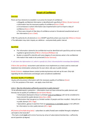 Comprehensive notes developed from a combination of lectures, tutorials and case readings. Structured in answering exam question step-by-step. Topics covered: -Intro to Equity - Breach of Confidence - Breach of Fiduciary Duty - Personal Remedies in Equity - Equitable Proprietary Remedies - Assignment of Property Rights in Equity