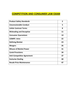 These are notes structured for answering exam questions, they are comprehensive and provide a step-by-step overview of each topic. Topics Include: Markets Mergers Misuse of market power Cartel Provisions Anti-Competitve Agreement Exclusive Dealing Resale price maintenance Intro to consumer law Manufacturer liability Product safety Unconscionable conduct Unfair contract Misleading and deceptive conduct Consumer guarantees