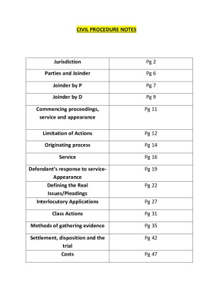 Comprehensive notes designed to answer exam style questions. Developed from lectures and case readings. Includes the following topics: Overarching principles Jurisdiction Drafting for Litigation/Pleadings Commencing proceedings Parties and Joinder Representative Proceedings/Class Actions Service/ Appearance Discovery and Gathering Evidence Interlocutory Orders Disposition and Settlement Trial Costs