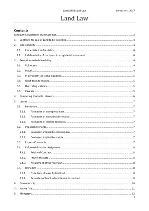 1. Contracts for Sale of Land to be in writing 2. Indefeasibility Immediate indefeasibility Indefeasibility of the terms in a registered instrument 3. Exceptions to Indefeasibility Volunteers Fraud In personam (personal equities) Short-term tenancies Overriding statutes Caveats 4. Competing Equitable Interests 5. Leases Formation Formation of an express lease Formation of an equitable tenancy Formation of implied tenancies Implied Covenants Covenants implied by common law Covenants implied by statute Express Covenants Enforceability after Assignment Privity of Contract Privity of Estate Assignment of the reversion Remedies Forfeiture of lease by landlord Remedies of landlord and tenant in contract 6. Co-ownership 7. Native Title 8. Mortgages Remedies of the Mortgagee – Power of sale 9. Easements Characteristics of Easements Types of Easements Creation of Easements by Court Order Extinguishment of Easements Easement and Torrens 10. Freehold Covenants Running of covenants in equity Enforceability of freehold covenants Intersection of freehold covenants with public planning regimes