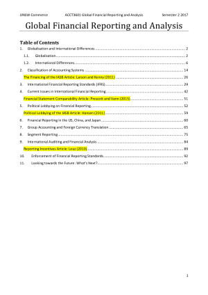 1. Globalisation and International Differences 2. Classification of Accounting Systems The Financing of the IASB Article: Larson and Kenny (2011) 3. International Financial Reporting Standards (IFRS) 4. Current Issues in International Financial Reporting Financial Statement Comparability Article: Prescott and Vann (2015) 5. Political Lobbying on Financial Reporting Political Lobbying of the IASB Article: Hansen (2011) 6. Financial Reporting in the US, China, and Japan 7. Group Accounting and Foreign Currency Translation 8. Segment Reporting 9. International Auditing and Financial Analysis Reporting Incentives Article: Leuz (2010) 10. Enforcement of Financial Reporting Standards 11. Looking towards the Future: What’s Next?