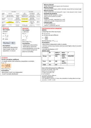 this is a double sided memory aid sheet for STAT 1070 that you are allowed to take into the exam room to help you to answer the questions. It contains all lectures and tutorials clearly labelled and very easy to read. this sheet contains: -Introduction & overview of statistics in the sciences such as mean, median, mode, standard devitaion etc -Understanding variation and describing univariate data -Bivariate relationships -Collecting data - surveys and experiments -Probability concepts eg babes theorem and law of total probability etc -Statistical inference hypothesis tests and confidence intervals of one sample, two sample, categorical and numerical etc -Simple bivariate statistical models including regression and ANOVA