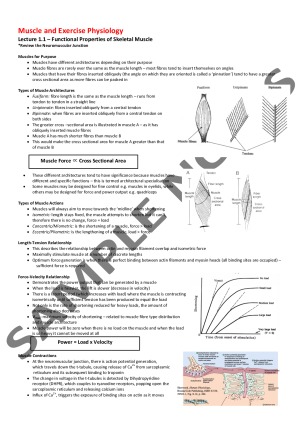 These notes cover all lectures and tutorial questions from weeks 1-4. For weeks 5-12, refer to my other listings. These are fully comprehensive, easy to follow and even contain all of the little details that lecturers have mentioned. They are great to follow even during your lectures The following lectures are in these notes: Lecture : Functional Properties of Skeletal Muscle Lecture : Overview of Exercise Metabolism Lecture : Carbohydrate Metabolism Lecture : Lipid Metabolism during Exercise Lecture : Protein Metabolism During Exercise Lecture : Disruptions in Lipid Metabolism and Metabolic Diseases Lecture : Metabolic Cross Talk, Exercise and Disease Lecture : Skeletal Muscle Fatigue Lecture : Oxygen Transport System During Exercise Lecture : VO2 Max and Ensurance Performance Lecture : Temperature and Fluid Balance during Exercise