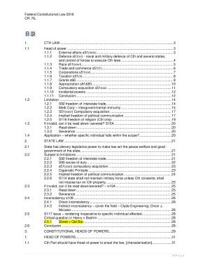 * head of powers (external affairs, defence, race, trade and commerce, corporations, taxation, grants, appropriation, compulsory acquisition, incidental powers) * freedom of interstate trade, excise of duty, Melbourne Corporations, Cigmatic, compulsory acquisition, implied freedom of political communication, freedom of religion * read down and severance * inconsistency * s 107 rendering inoperative