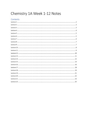 Comprehensive notes for Chemistry 1A. Includes notes for all content from Week 1-12, formatted and written for easy understanding (particularly for more complex topics towards the end of semester) Topics covered include: * The atom * Measurement * Representation of molecules * Chemical equations * Solution stoichiometry * Acids and bases * Redox reactions * Atomic energy levels * Gases, liquids and solids * Thermodynamics * Equilibrium * Aqueous solutions * Solubility These notes were compiled by a Chemistry 1A tutor, so you can trust that the information is both correct and focused on what you need to know for exams.