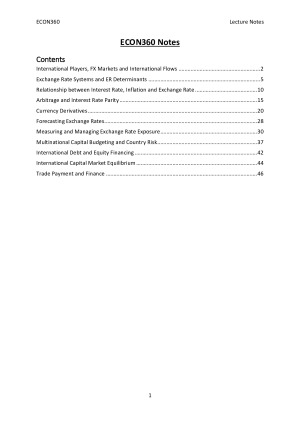 I have provided extensive notes with graphs and diagrams included for ECON360. Graphs and diagrams are the best way to grasp concepts in this unit and helped me immensely. All topics included were covered in either the mid semester test, final exam or both. Topics: - International Players, FX Markets and International Flows - Exchange Rate Systems and ER Determinants - Relationship between Interest Rate, Inflation and Exchange Rate - Arbitrage and Interest Rate Parity - Currency Derivatives - Forecasting Exchange Rates - Measuring and Managing Exchange Rate Exposure - Multinational Capital Budgeting and Country Risk - International Debt and Equity Financing - International Capital Market Equilibrium - Trade Payment and Finance