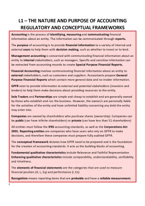 Professional quality notes from a H1 student that will serve as an excellent study AND revision tool. Includes detailed information on ALL 12 WEEKS of lecture content: 1. The Nature and Purpose of Accounting Regulatory and Conceptual framework 2. Transaction analysis and financial statements 3. Balance sheet - Assets 4. Balance sheet - Liabilities 5. Statement of Profit and Loss, Statement of Comprehensive income, Statement of Changes in Equity 6. Statement of Cash Flows 7. Financial Statement Analysis 8. Financial Statement Analysis 9. Budgeting 10. Cost Volume Profit analysis 11. Sustainability and Accounting 12. Course Review: Exclusive exam revision checklist including all necessary knowledge These notes are suitable for: ✅ Students who are looking for assistance in UNDERSTANDING the content in the lecture slides My notes are not just paraphrased lecture slides – they contain my own explanations and ways of thinking about the content. This should give you an alternate explanation where the lecture slides are too brief to enable full understanding. I also include diagrams to help visually convey difficult concepts. ✅ Those who are looking to save time and have a compact REFERENCE to assist during the semester The coloured lecture summary boxes will assist you with regular revision, and the clear structure and titles used in my notes will help you to refer back efficiently so you can focus more on consolidating knowledge and doing questions to get a head start on your classmates when it comes to SWOTVAC time. Along with necessary information from lecture slides, my notes also contain: ✅ My personal explanations or ways of thinking about accounting concepts ✅ My self-made diagrams and coloured annotations to provide visual aid and to help with recollection and to provide step-throughs that the lecture slides lack ✅ Summaries of the key points of each lecture in the coloured box at the start of each chapter ✅ A checklist of all essential knowledge and learning intentions for exam revision These notes contain both the DETAILS to help you first understand the material and the SUMMARIES to help you revise come exam time. They should serve as a more PERSONALISED study tool when the lecture slides lack DEPTH or FULL EXPLANATIONS. I use narrow margins to fit in the wide chapter summary boxes and size 12 font. When the margins are increased to normal size the document is 79 pages long. I am very fond of accounting as a subject, having achieved a 49 in VCE accounting and now H1s at university level, hence my notes reflect my attention to detail and knowledge of both the theory and technical aspects of the course I hope they will be of just as much help to you as they were to me – Best of luck!