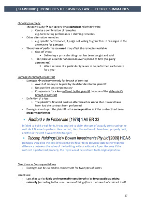 Includes topics that was taught in the lecture as well as cases covered within Principles of Business Law Semester 1, 2017: - The Nature and Function of Law - Legislation as a source of Law - The Role of Courts in Law-Making - Contract formation: Creating Legally Binding Contracts - Terms of a Contract - Discharge of Contractual Obligation - Remedies Types of Breach of Contract - Circumstances that may invalidate legal transactions - Consumer Protection - Tort Law - Property Law & Agency Law Cases are summarised and concepts have been broken down so that they can be more easily understood. Please look at preview for more details.