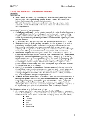 These notes provide a comprehensive analysis on each of the literature readings examinable in the FINC3017 course. The readings covered are: Kritzman – The graceful aging of mean-variance optimisation Michaud – The Markowitz Optimisation Enigma: Is ‘Optimized’ Optimal? Page and Taborsky – The Myth of Diversification: Risk Factors versus Asset Classes Lamont and Thaler – The Law of One Price in Financial Markets Arnott, Hsu and Moore – Fundamental Indexation Fama & French (2004). The capital asset pricing model: theory and evidence Elton, Gruber, Brown & Goetzmann (2003). Modern Portfolio Theory and Investment Analysis Asness & Liew. (2014). The great divide over market efficiency Ang. (2014). Illiquid assets (from ‘Asset management: a systematic approach to factor investing)
