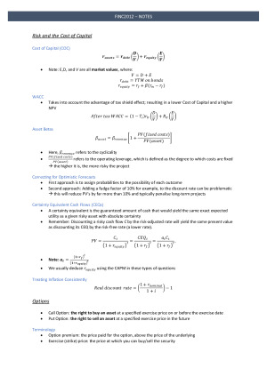 These notes cover every week of lectures and are grouped into the following broader topics: - Risk and the Cost of Capital - Options: Theory and Valuation - Agency Problems and Performance Measures - Six Factors That Explain Executive Pay (and its Problems) - O’Byrne 2010 - Residual Income / Economic Value Added (EVA) - An Overview of Corporate Financing - How Corporations Issue Securities - Does Debt Policy Matter? - How Much Should a Corporation Borrow? - Valuations - Dividends payments