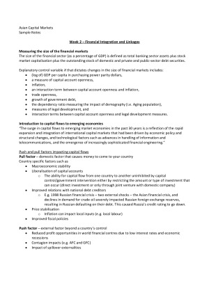 Comprehensive notes comprising lecture notes, tutorial notes as well from readings etc. I have personally used these notes to achieve the highest mark in the cohort for the group assignment as well as a H1 grade for the final exam. Contents: - Introduction to Global and Asian Capital Markets - Financial Integration and Linkages - Asian Financial Crisis (AFC) and the Global Financial Crisis (GFC) - Asian Equity Markets - Asian Debt Markets - Asian Capitalism and Corporate Governance - Asian Company Analysis 1 - Asian Company Analysis 2