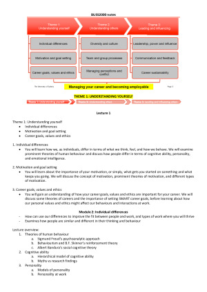Very detailed BUSS2000 notes - has all lecture content that are formatted in a easy way to understand and I essentially typed out the script of all the videos. Topics included: - Individual differences: cognitive ability, personality, and emotional intelligence - Motivation and goal-setting - Diversity and culture - Team and group processes - Managing perceptions and conflict - Leadership, power and influence - Communication and feedback - Career sustainability: managing relationships and stress Has the whole semester's worth of content in detail. As long as you study these notes and do the readings, you should be able to get a decent mark.