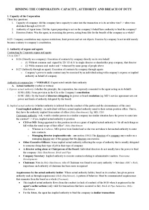 LAWS2014 Corporations Law Scaffold that covers relevant topics for the final exam It is formatted in a way that allows you to go through all the relevant factors of each topic during the open book exam. Topics included: - Binding the Corporation - Directors’ Duties - Members’ Rights and Remedies