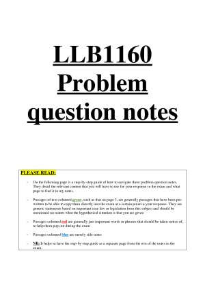 Very comprehensive exam notes. The content is useful for the problem question, essay and short answer question in the exam. The problem question notes are detailed and very concise. Answering problem questions for this subject can be very confusing and is not straight forward at all, like contracts for example. Thus i have provided a reference page or a 'cheat sheet' or sorts at the beginning of my problem question notes which details what page to find certain information and in order of how you should answer an exam problem question. At the bottom of the document i have also included essay notes under hypothetical paragraph sub-headings for a few very broad essay questions i chose to construct myself, with the help of my seminar leader. These questions capture just about all the content from the course that could potentially be asked as an essay. The notes are full sentences making general points relevant to the particular essay topic but are provided in dot-point form so they can be easily adapted into an essay as you're writing it out in an exam. The points are not too narrow so at to be irrelevant if the question is slightly different, they are broad questions with broad answers. Topics: Approaches to Constitutional Interpretation Values & Policy in Statutory Interpretation Intention, Context and Purpose Intrinsic Materials Extrinsic Materials Presumptions, Maxims and Canons Legislation, Precedent and Judicial Approaches Recent Cases & Particular Acts Delegated Legislation
