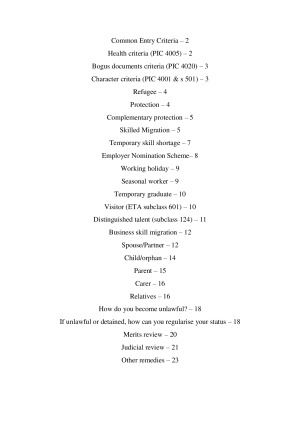 Scored an overall of 74 (D) in T3 2018. Common Entry Criteria Health criteria (PIC 4005) Bogus documents criteria (PIC 4020) Character criteria (PIC 4001 & s 501) Refugee Protection Complementary protection Skilled Migration Temporary skill shortage Employer Nomination Scheme Working holiday Seasonal worker Temporary graduate Visitor (ETA subclass 601) Distinguished talent (subclass 124) Business skill migration Spouse/Partner Child/orphan Parent Carer Relatives How do you become unlawful? If unlawful or detained, how can you regularise your status Merits review Judicial review Other remedies