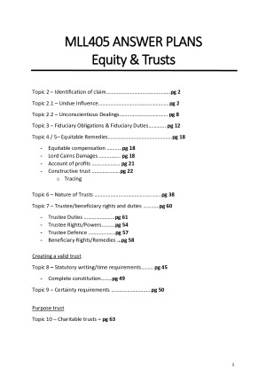 These answer plans were my secret to success for equity and trusts. As it is a must feared level 4 unit, I prioritised making clear answer plans to guide me through the assessments and the time and effort I put into these plans were well worth it. These answer plans are formed through consolidating: lecture notes, textbook readings, cloud content and personal research. I believe they provide a solid overview all the relevant case law and legislation relevant to this unit. The answer plans are color coordinated, as below: Yellow = Legislation Green = Case law Blue = Exam/assessment sentence starter Topics included within these answer plans are: Topic 2 – Identification of claim Topic – Undue Influence Topic – Unconscientious Dealings Topic 3 – Fiduciary Obligations & Fiduciary Duties Topic 4 / 5– Equitable Remedies - Equitable compensation - Lord Cairns Damages - Account of profits - Constructive trust - Tracing Topic 6 – Nature of Trusts Topic 7 – Trustee/beneficiary rights and duties - Trustee Duties - Trustee Rights/Powers - Trustee Defence - Beneficiary Rights/Remedies Creating a valid trust Topic 8 – Statutory writing/time requirements - Complete constitution Topic 9 – Certainty requirements Topic 10 – Charitable trusts – pg 63 Good luck and I hope you find these answer plans as much of a blessing in the exam as I did! :) Note: within these answer plans there are sections which state "refer to page x of notes", these comments refer to my larger set of detailed notes which are for sale separate from these answer plans. However, these answer plans alone provided sufficient overview for a general understanding and answer plan format (as you can see from the sample provided).