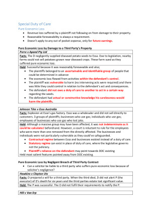 These notes helped me get a HD on the Torts exam and a Distinction in the overall subject. These notes cover all the torts and defences in LAW1113, with descriptions of the elements and cases to back them up. It includes short and to-the-point summaries of all the cases, highlighting the important points. In addition to case summaries, there are clear explanations of how and when to apply them, when not to apply them and basic flowcharts on how to answer exam questions for different torts. Topics Covered: - Trespass to Person (Assault, Battery & False Imprisonment) & Defences - Trespass to Land & Defences - Private Nuisance & Defences - Negligence (DOC, Special DOC, Breach of duty, Causation, Remoteness) & Defences (Volenti, Illegality, Good Samaritans & Volunteers) - Damages - Vicarious Liability