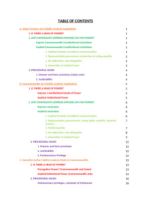 This is a summary of the entire course, designed in a layout for you to use during the exam. Everything is colour-coded under separate headings for you to complete a high-level validity analysis for State or Territory Acts, Commonwealth Acts, and Executive Action. Under each of these actions you will find a checklist for establishing whether there is a head of power, analysing any constraints on that power, and checking for any procedural issues that may arise. Everything is logically structured and condensed, to avoid wading through repeated information when you're under time pressure in the exam.