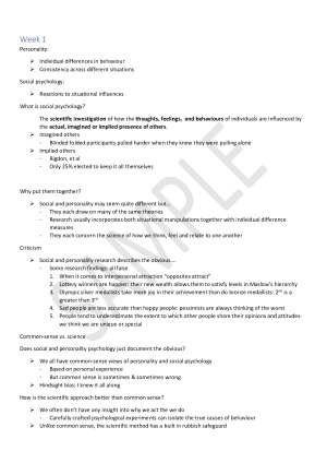 13 weeks worth of lecture content notes based on the following topics: Personality assessment, neuropsychoanalysis, trait approaches to personality, evolutionary psychology & personality, humanistic and positive psychology , personal construct theory, social psychology research, person perception, attributions, emotion and group influence